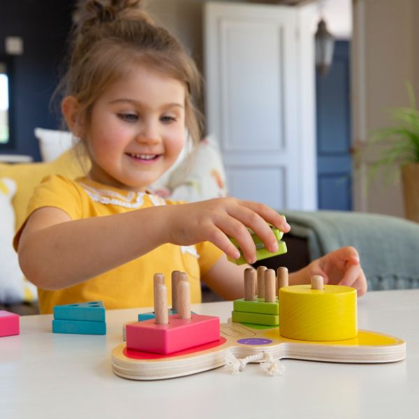 Your child will develop a better feeling for the different colours and shapes. The small wooden rods on which your little one can stack the colourful blocks are numbered one through four, helping your child learn to count as well. The wooden blocks are perfect for little fingers.