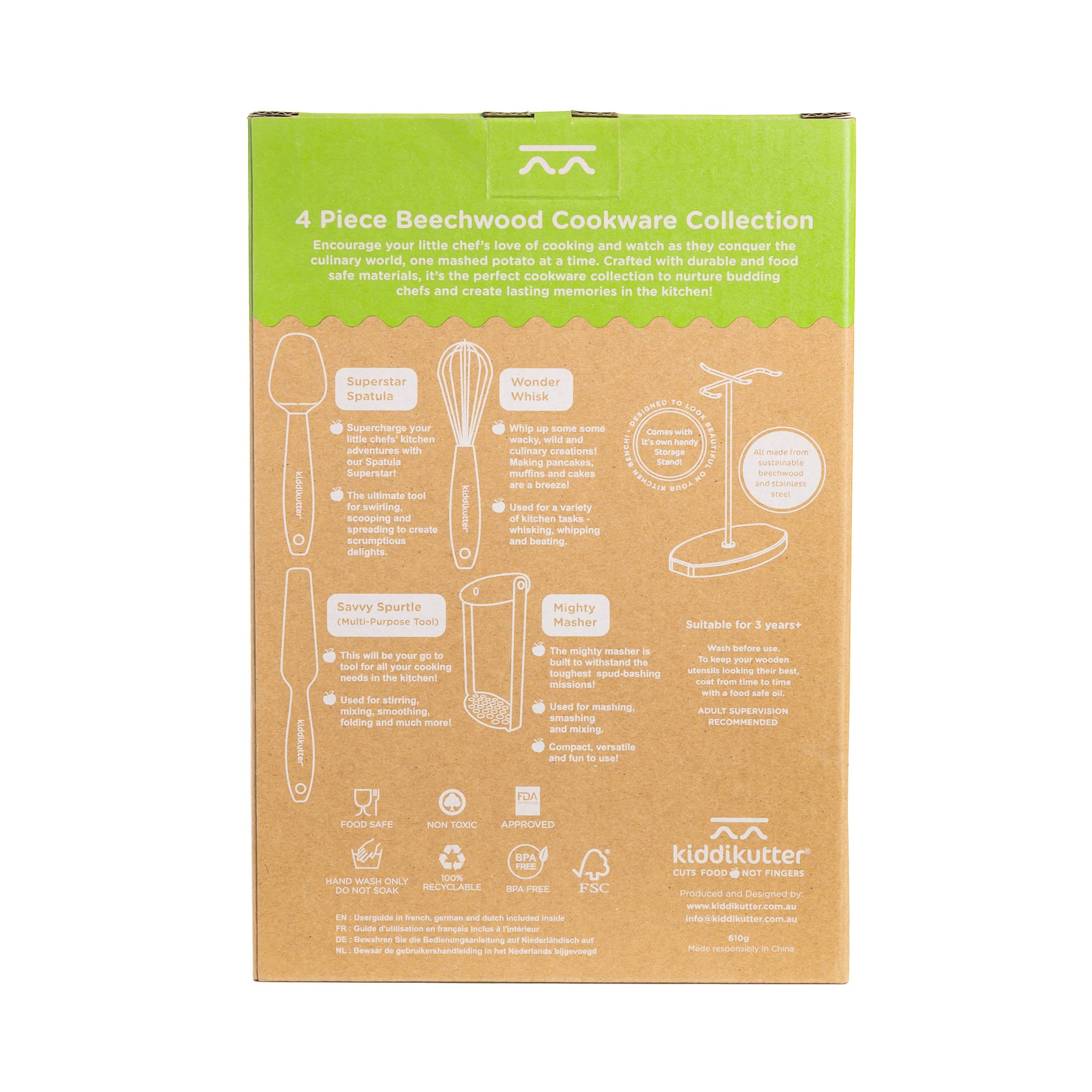 - 4 Piece Beechwood Cookware Collection: whisk, spatula, masher & spurtle plus a hanging stand