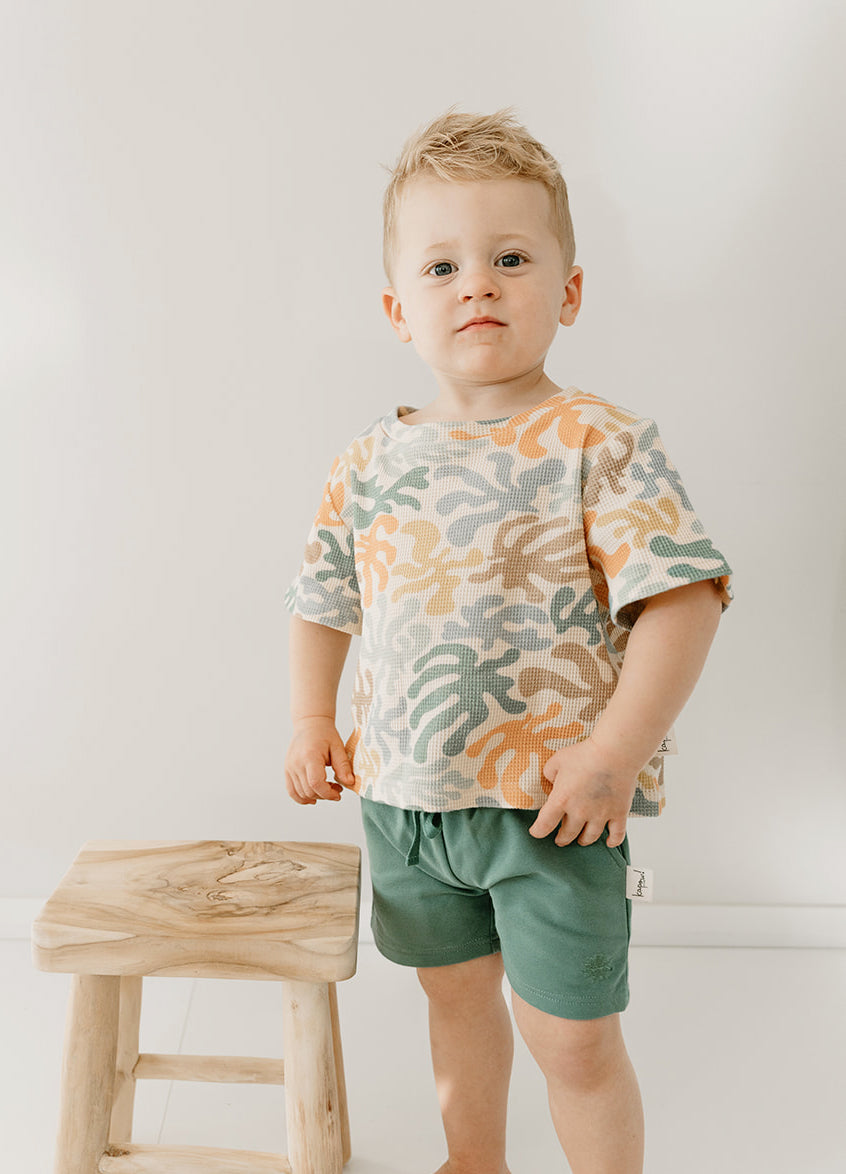 Dive into comfort with the Deep Sea Shorts! These plain teal basic shorts are perfect to style with the Coral Waffle T-shirt. Lightweight and easy to wear, they keep your little one cool and ready to explore every splash and sandy shore. Simple, stylish, and made for fun!