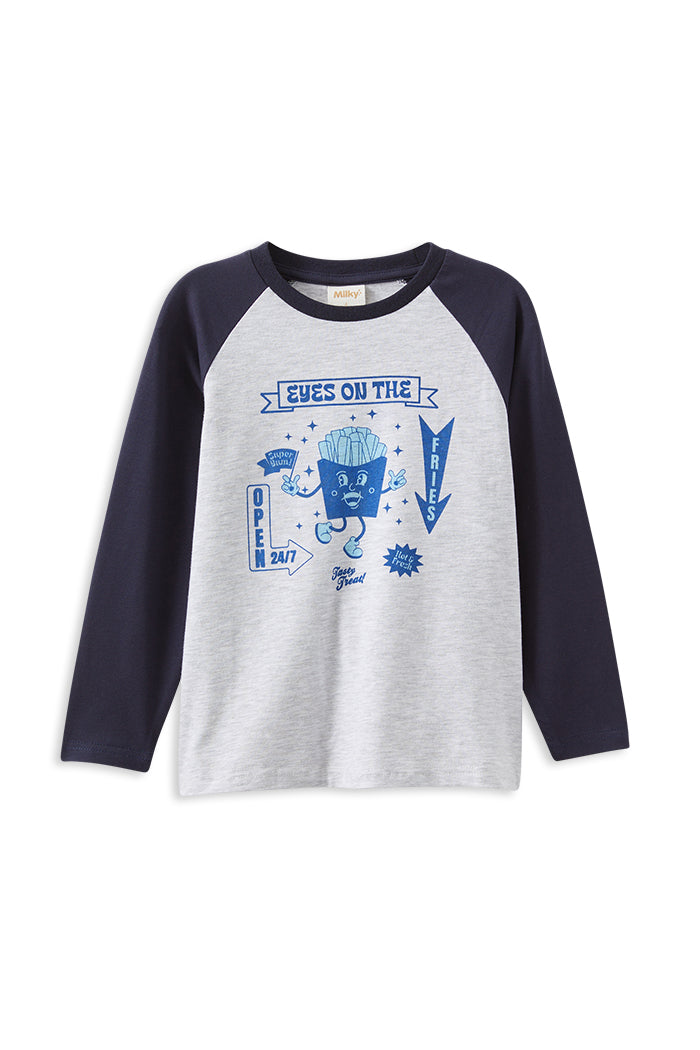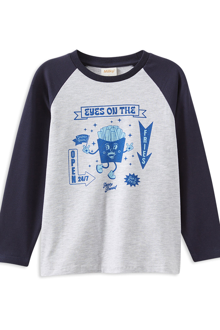 Milky Clothing Eyes On The Fries Tee is a playful choice that’s bound to become a wardrobe favorite! Featuring a fun graphic print on the center front set against a classic silver marle backdrop, this tee is enhanced with navy raglan-style sleeves, making a striking statement with its eye-catching design.