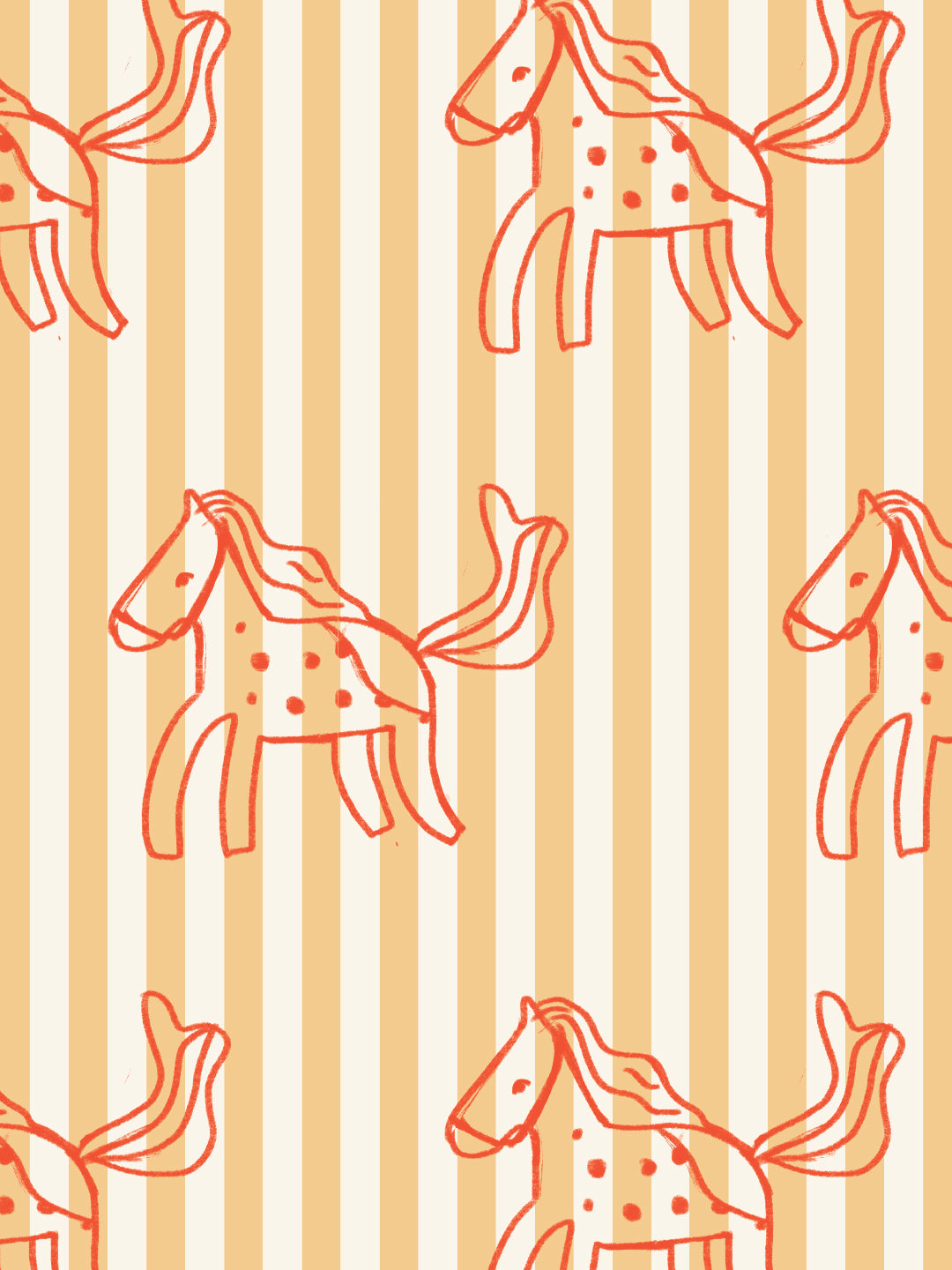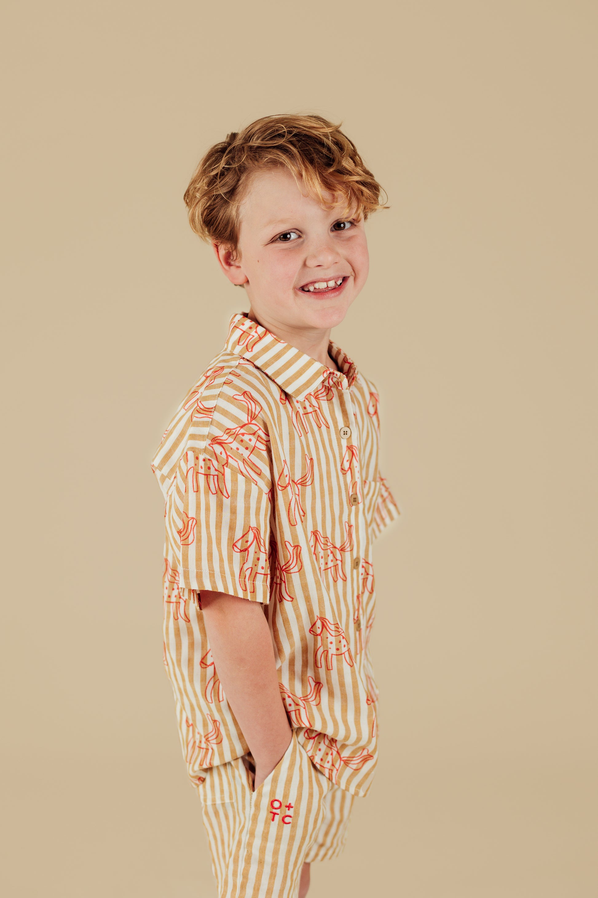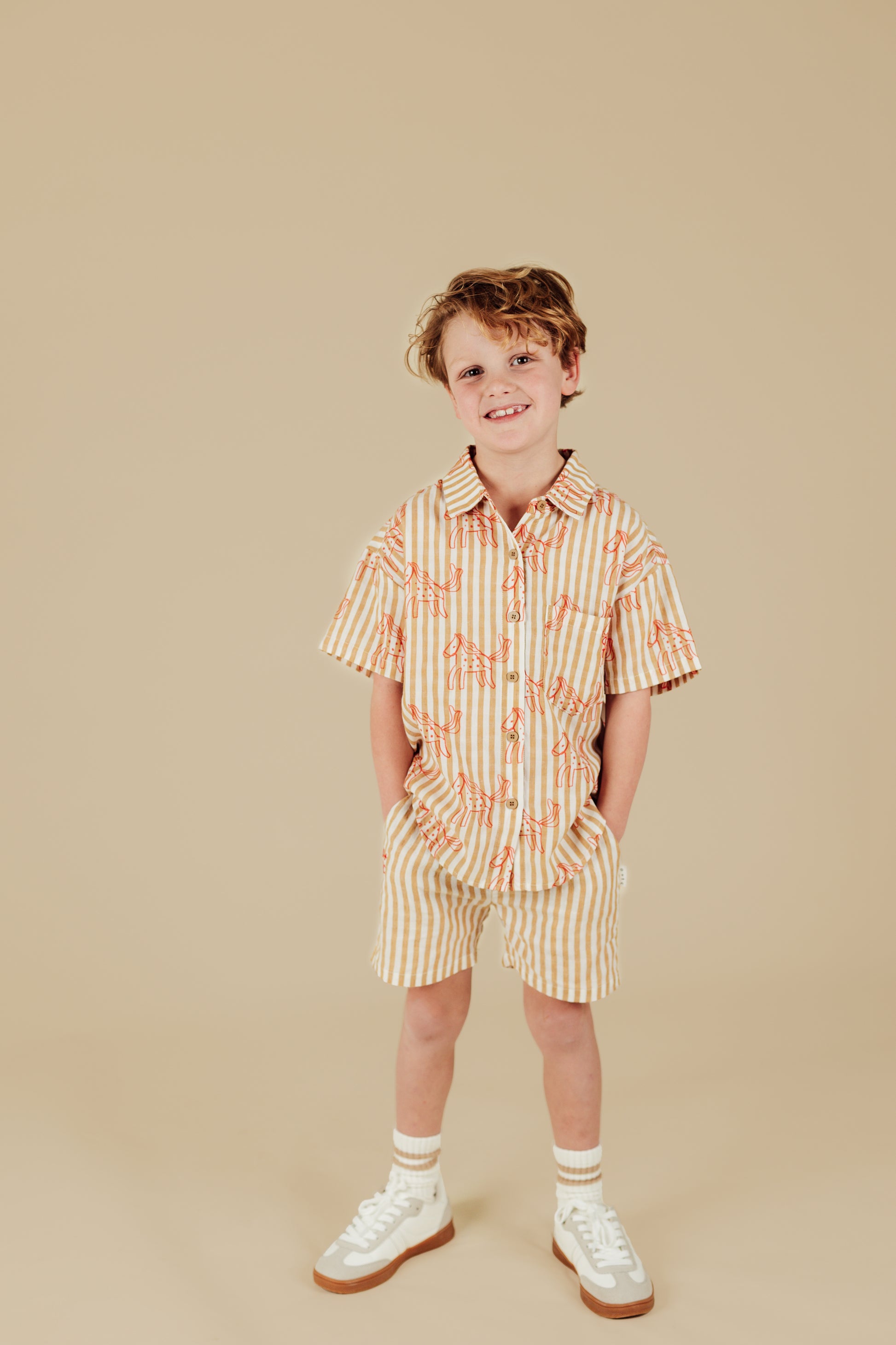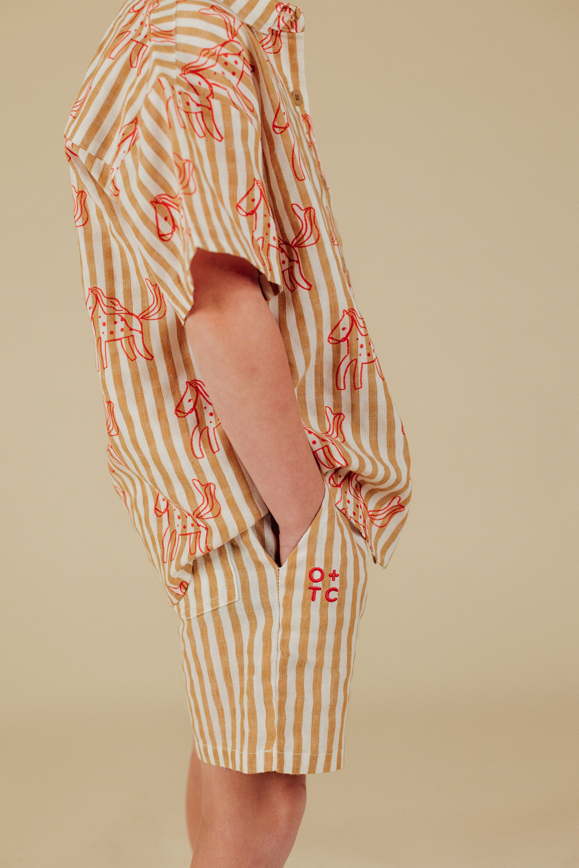 Lightweight beige and golden mustard striped cotton with hand-drawn horse print in punchy red. Perfect as a casual summer shirt or layering piece.