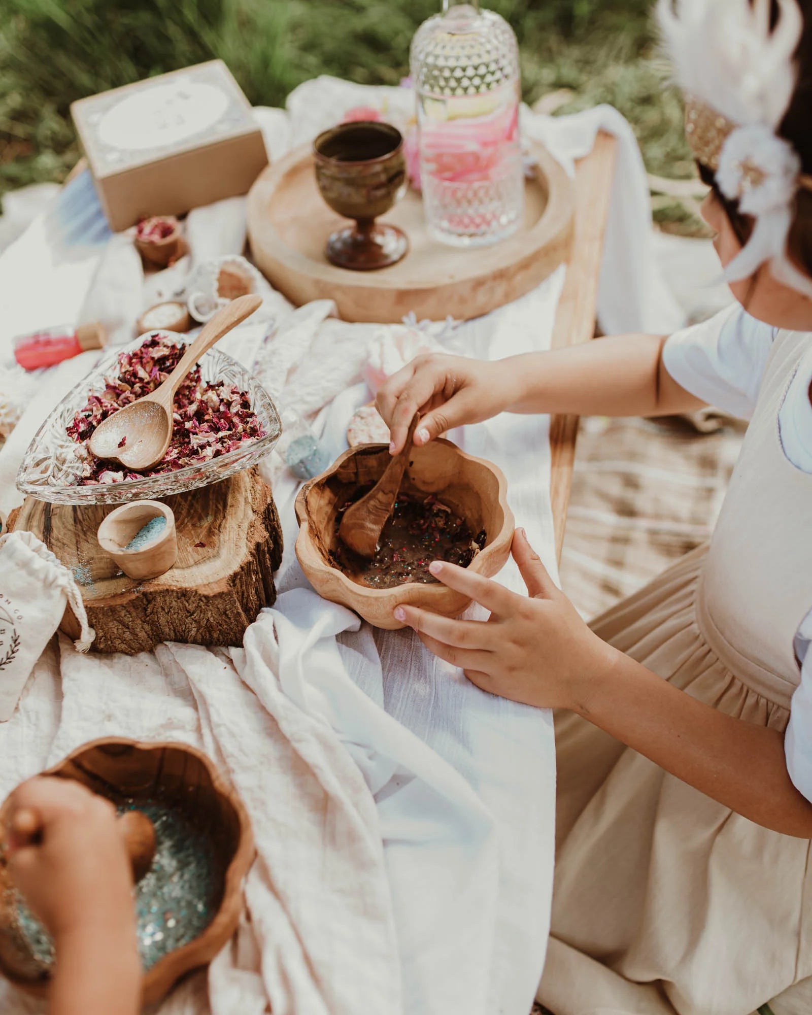 Salt, citric acid, bicarb, mica, bio glitter, dried flowers, dried herbs, food dyes.