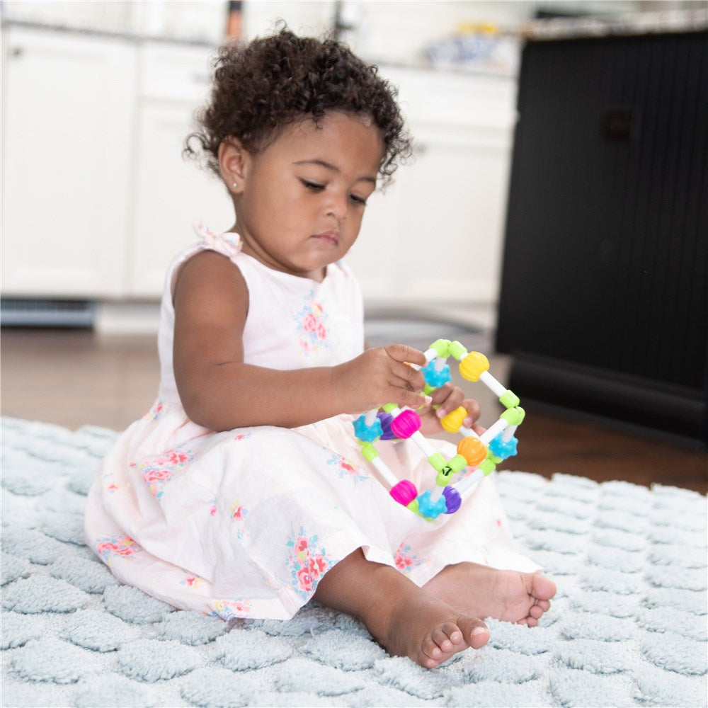 Each edge is connected by elastic bands to allow little hands to bend it and twist it this way and that. Meanwhile, the rubbery textured beads spin and slide for an extra boost of sensory fascination.