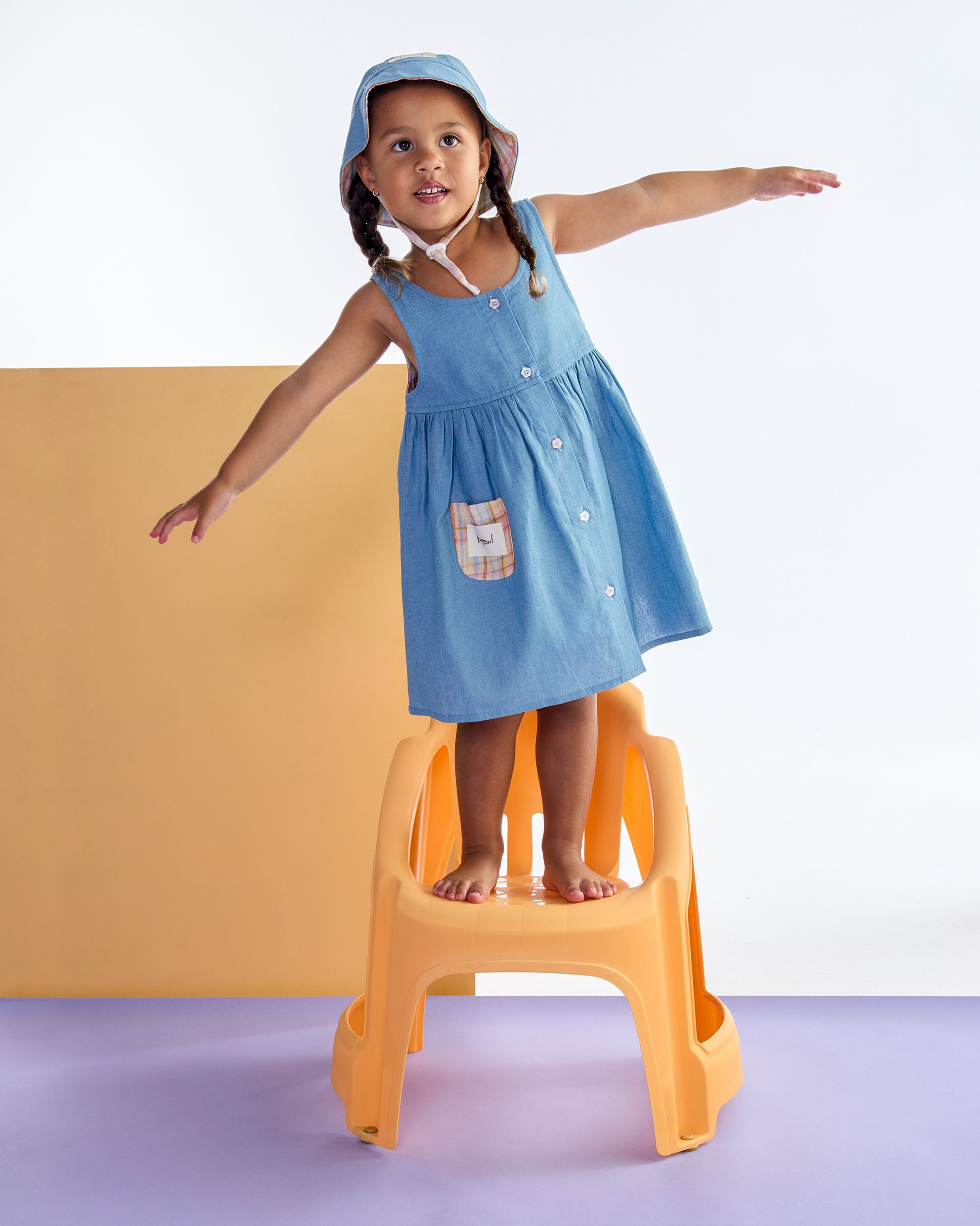 This Rainbow Plaid Sleeveless Dress brings fun flair to any day with bright plaid accents and charming flower buttons. Made from soft denim, it’s comfy and easy to wear, while handy pockets add a practical touch for little treasures. Perfect for playdates and sunny adventures!