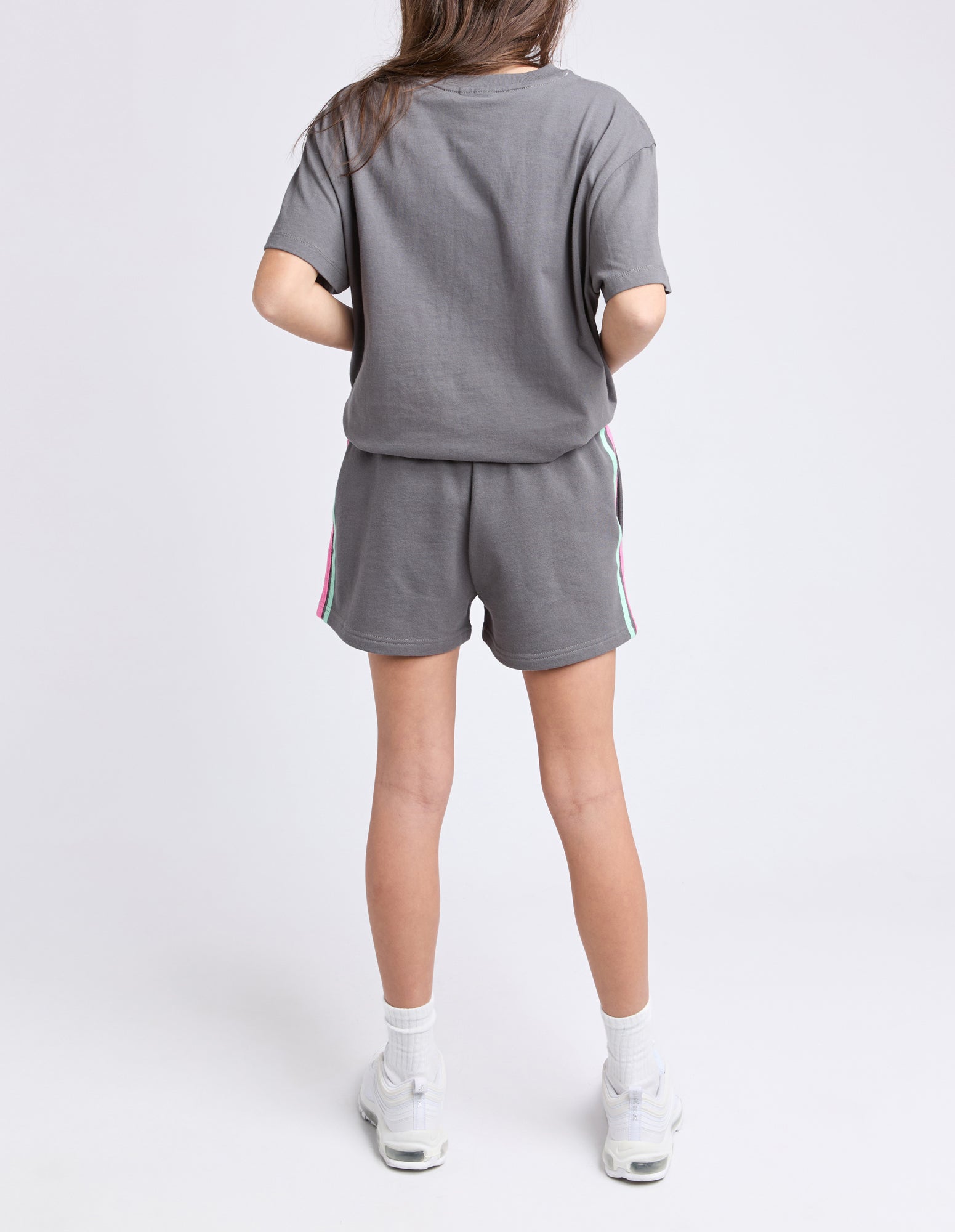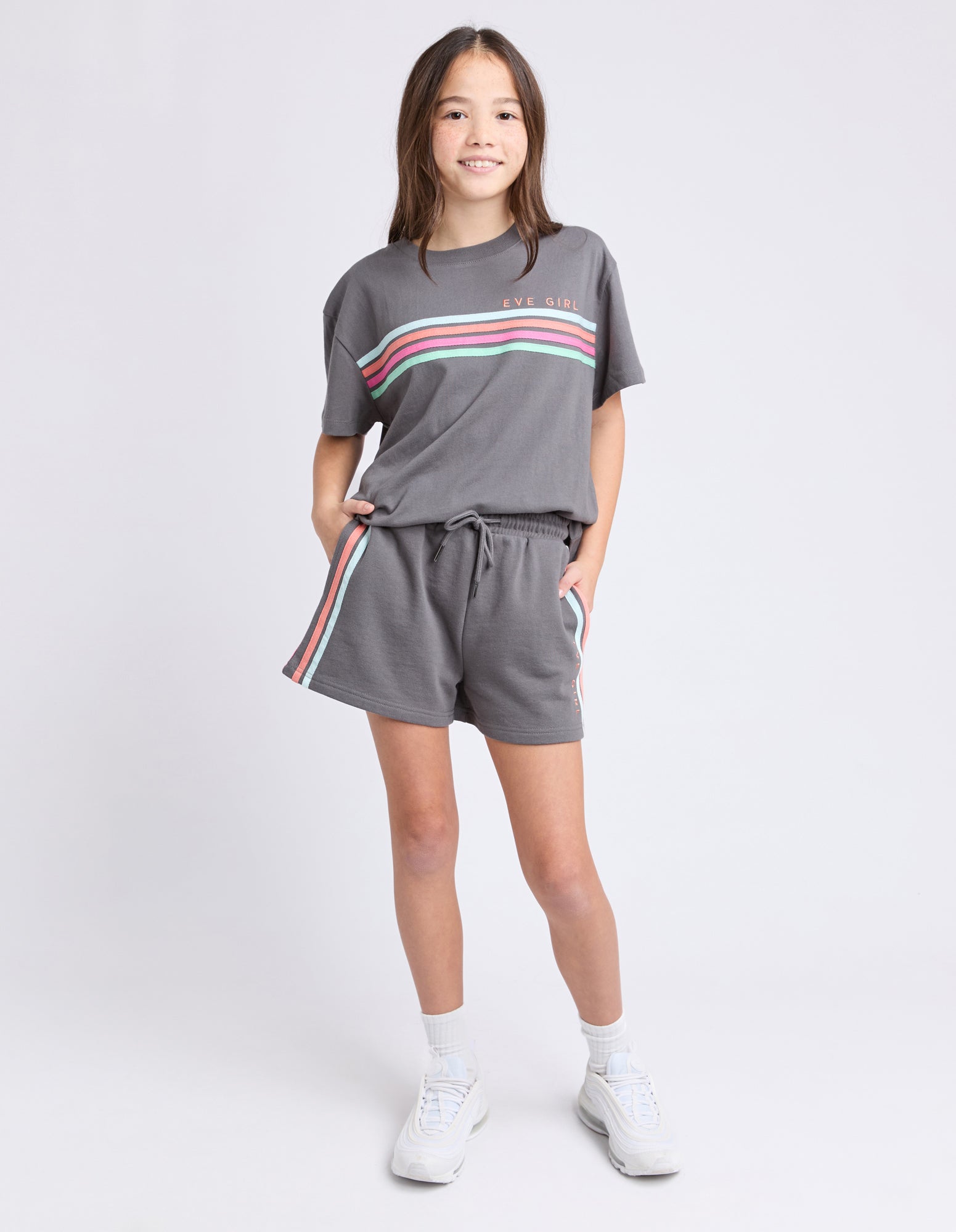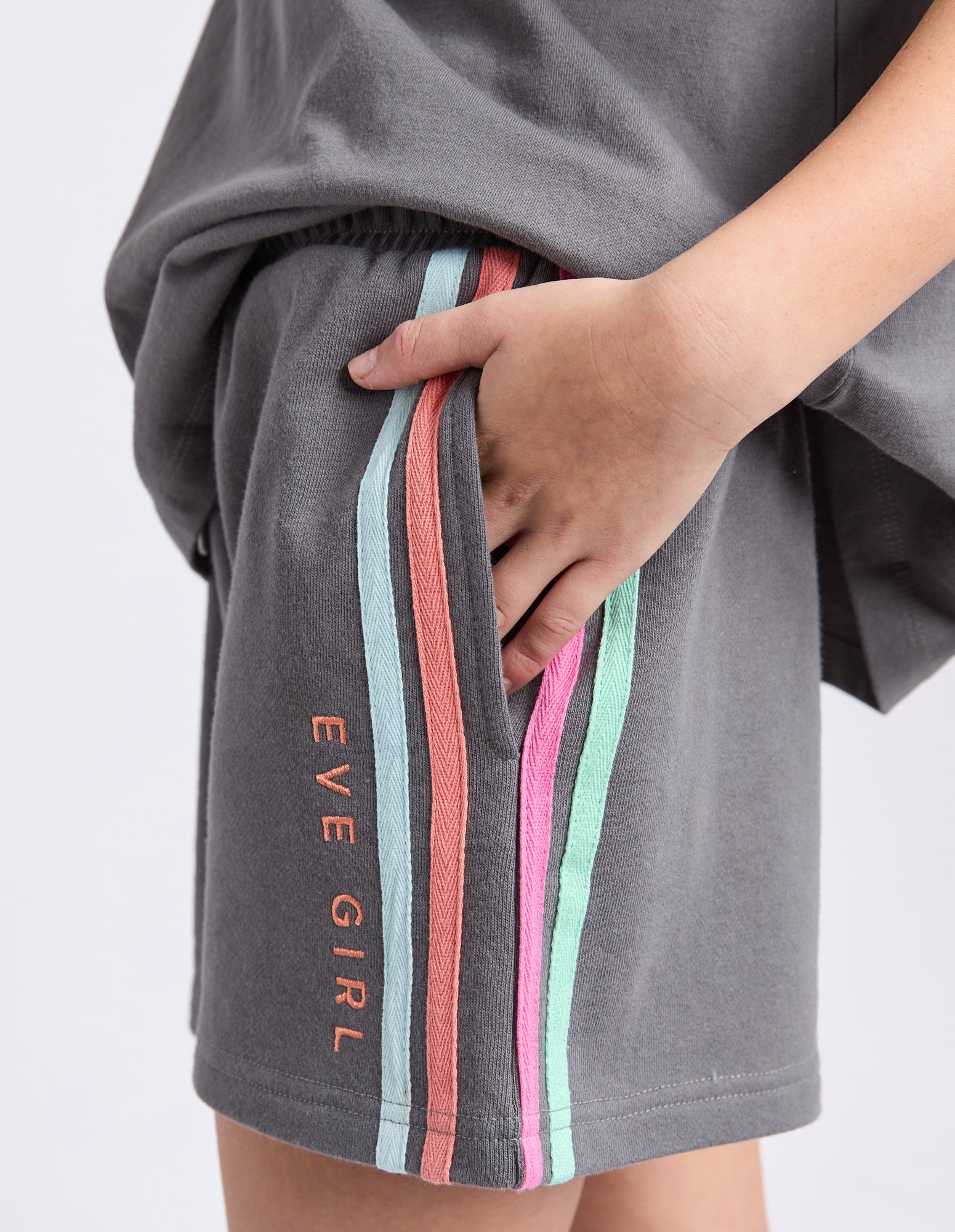 Embrace the sporty vibe this summer with the Retro Fleece Short by Eve Girl. This style features contrast side seam tape, elastic waistband, drawcord and side seam pockets, on an unbrushed fleece fabrication.
