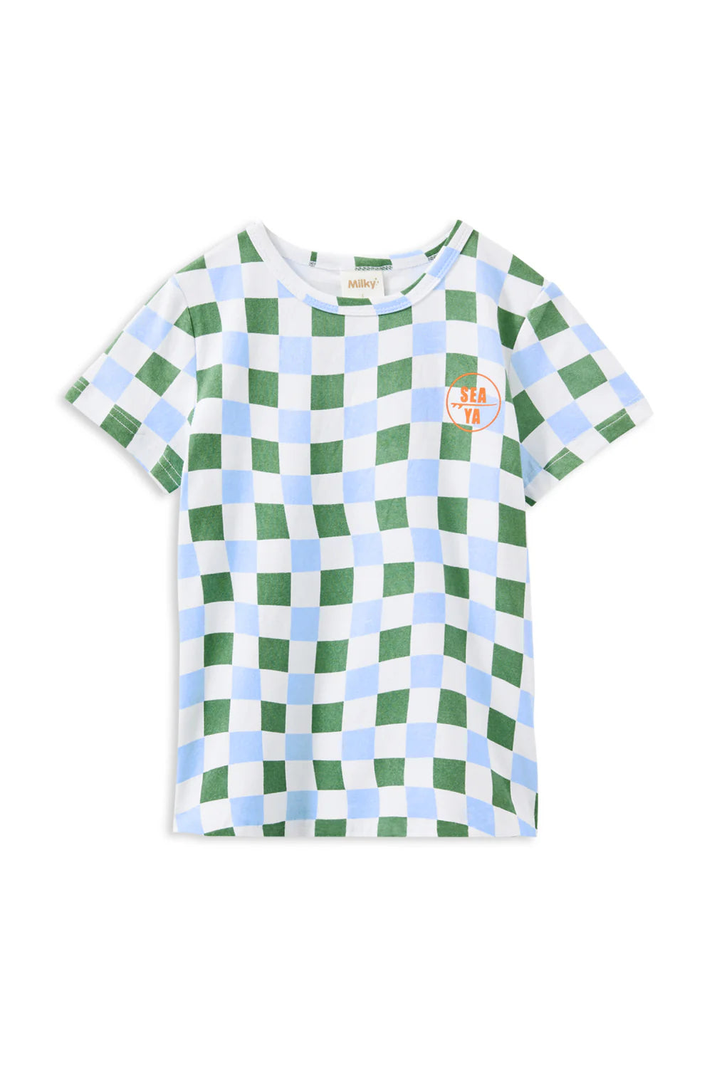 Milky Clothing Sea Ya Tee is the perfect blend of style, comfort, and versatility—an essential addition to your little one’s summer wardrobe. This cool short-sleeve t-shirt is designed to keep them looking sharp and feeling comfortable all day long, whether they're enjoying outdoor adventures or relaxing at home. The off-white base is beautifully complemented by a playful green and blue abstract check print, adding a fun, modern touch to their look. Crafted from soft, breathable fabric, this tee ensures they stay cool and comfortable while effortlessly standing out in style. A must-have for any summer wardrobe!