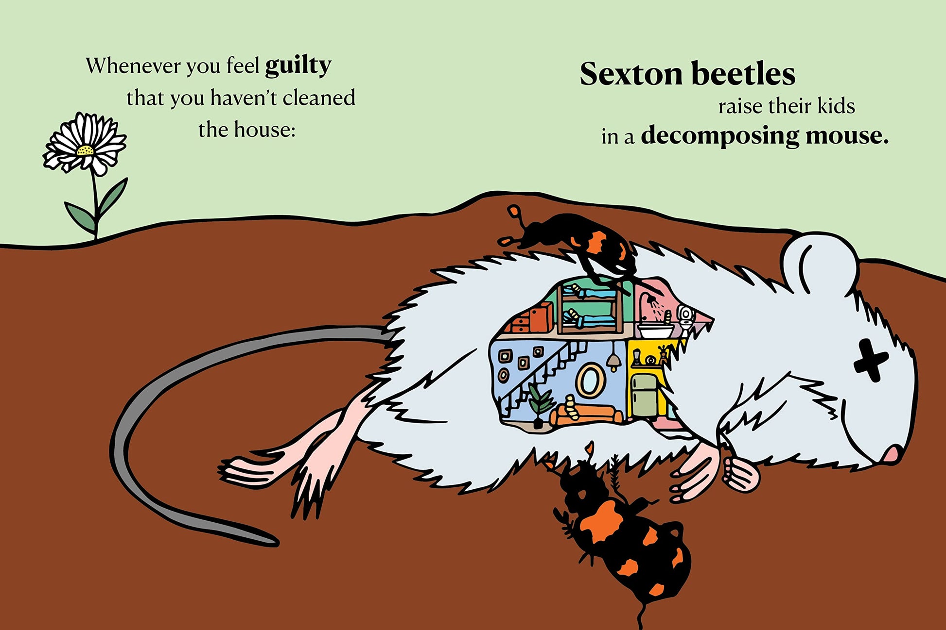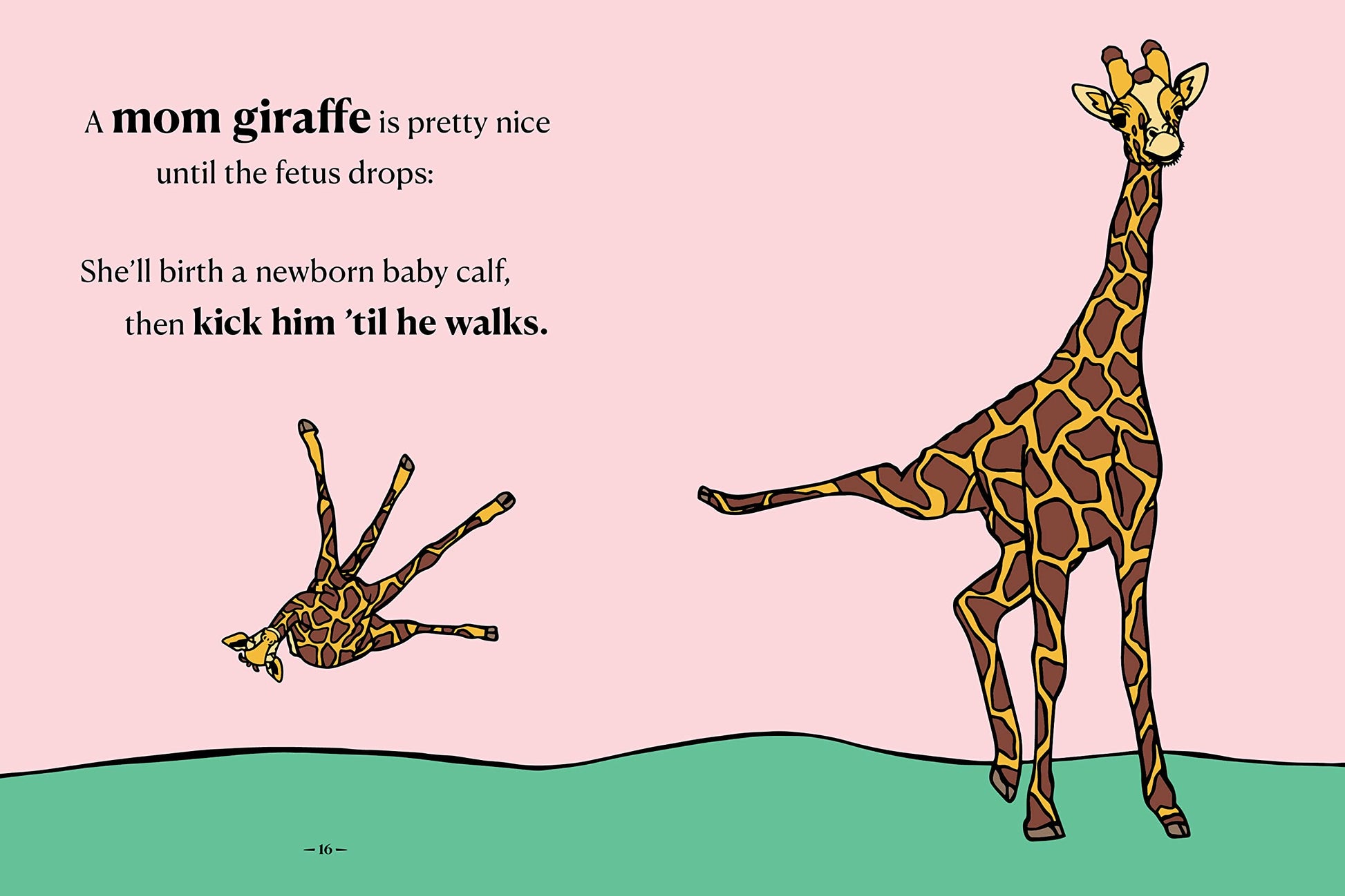 A mum giraffe is pretty nice until the foetus drops. She’ll birth a newborn baby calf, then kick him ’til he walks. Whenever you feel guilty that you haven’t cleaned the house – Sexton beetles raise their kids in a decomposing mouse. A koala mum will feed her kids her own poop. Yes, poop. Panda mums will abandon one twin because raising two is, well, just too much. And every now and then a cuddly little hamster mum will – yup – eat her newborn pups.