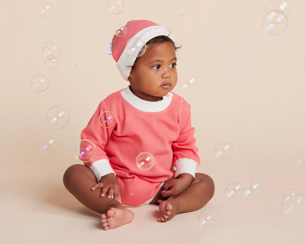 Made from an organic cotton waffle and bound with a delicate playful rib, it's soft on baby and the world we live in.